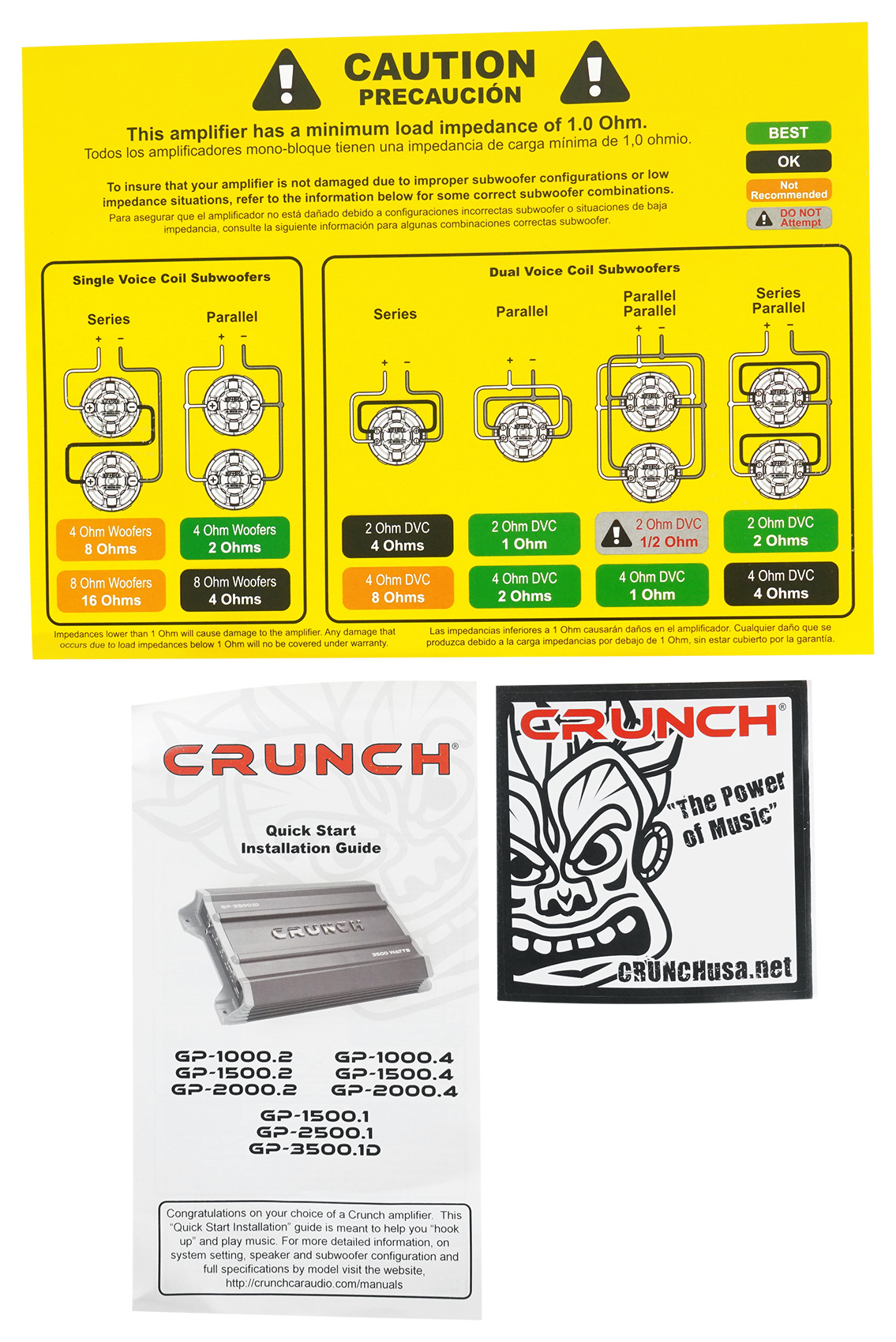 Crunch Ground Pounder with QTD Technology delivers 3500 watts at 1 ohm stability to subwoofers and features include built-in electronic crossovers and includes bass remote.